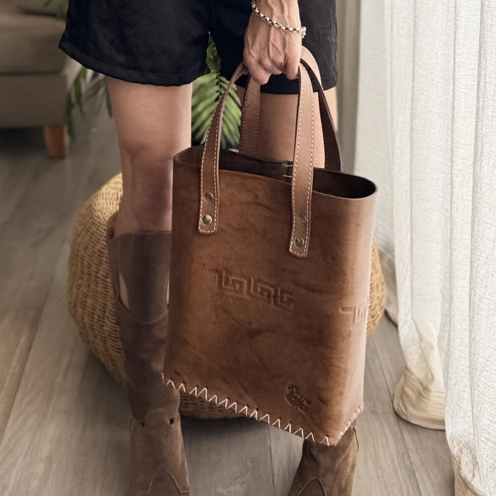Fabricada en cuero genuino y terminada con costuras artesanales, cuenta con manijas reforzadas de 27 cm que brindan firmeza y confort al llevarla. Su base rectangular (12 × 25 cm) ofrece el espacio justo para tu termo, mate, yerbera y más.